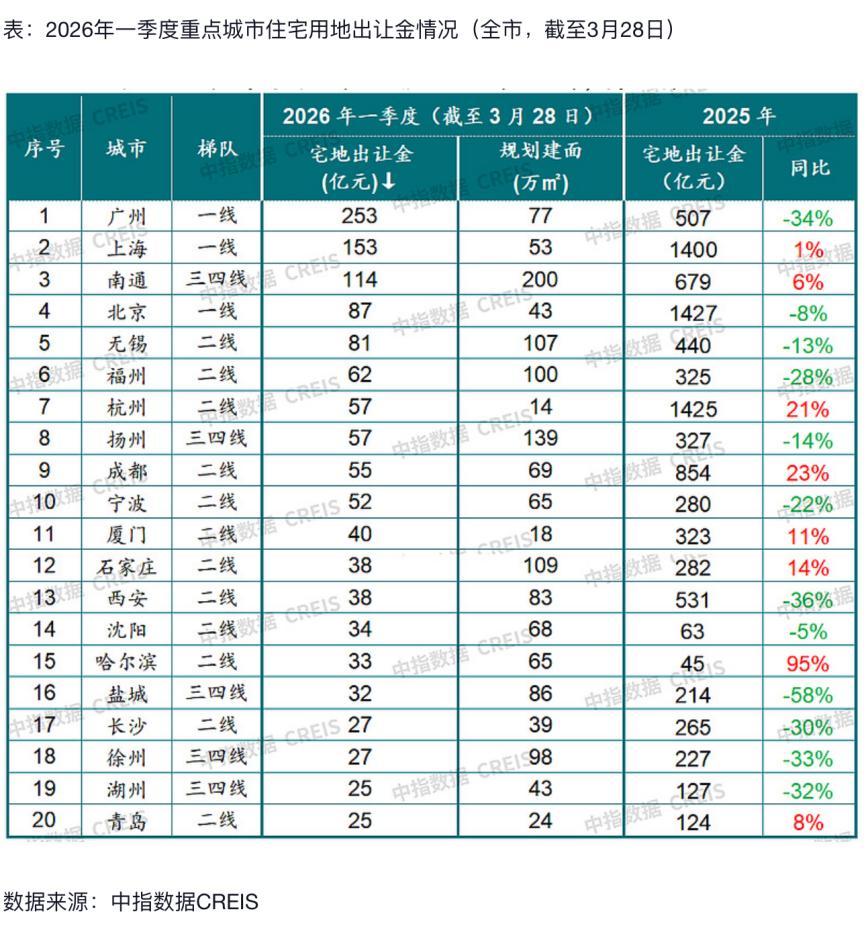 據中指研究院數據,2026年一季度(截至3月28日),22個核心城市裏,央國企拿地佔比高達58%,北京、上海等地甚至超過60%。