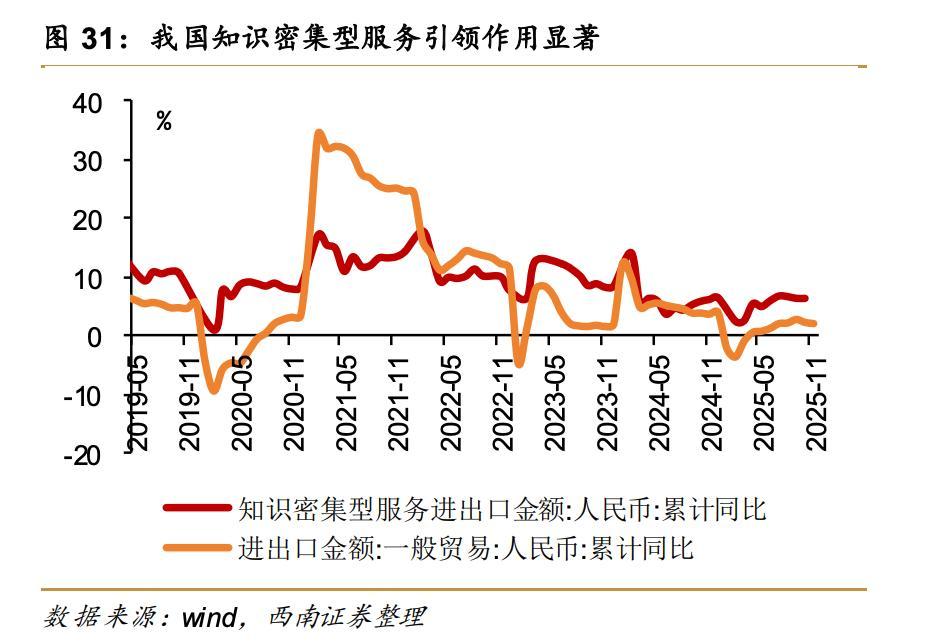 據西南證券的整理,2022年以來,中國知識密集型服務增速比一般貨物貿易更快,中國正從商品大國轉爲服務大國。