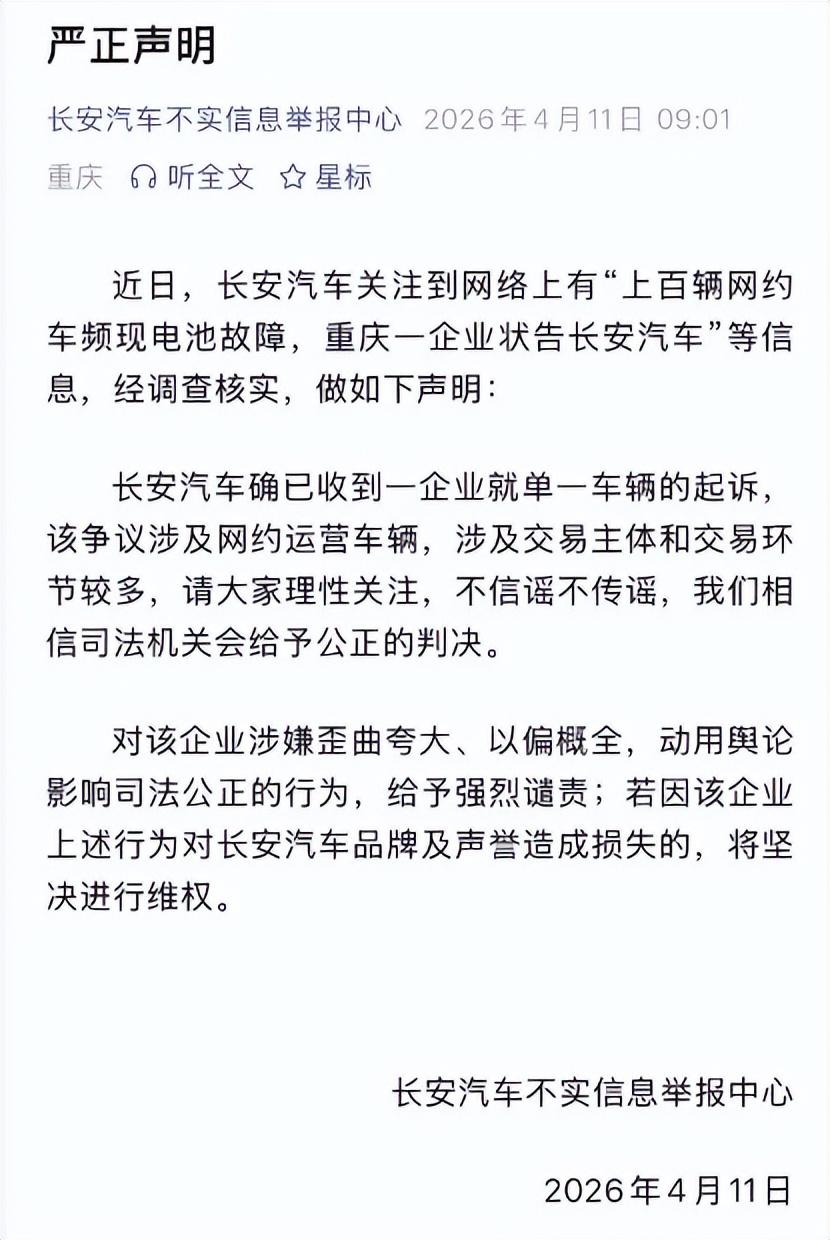 年報發佈後,“400輛網約車電池故障”相關風波,將長安汽車推至品牌信任的風口,對此,長安汽車方面回應稱僅涉及單一車輛,司法鑑定顯示車輛存在線路改裝隱患,並非原廠質量問題。據悉,該案定於5月27日開庭。