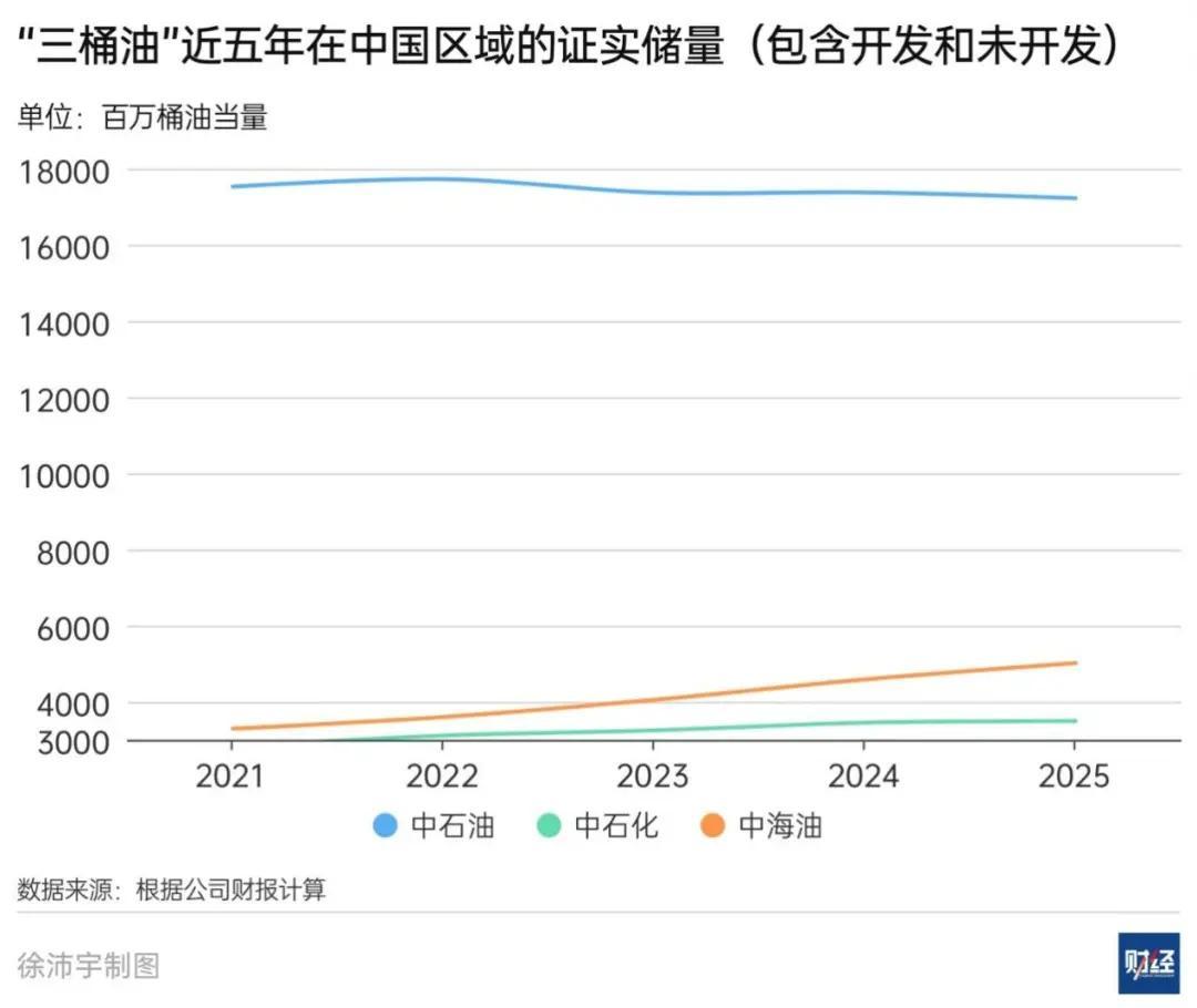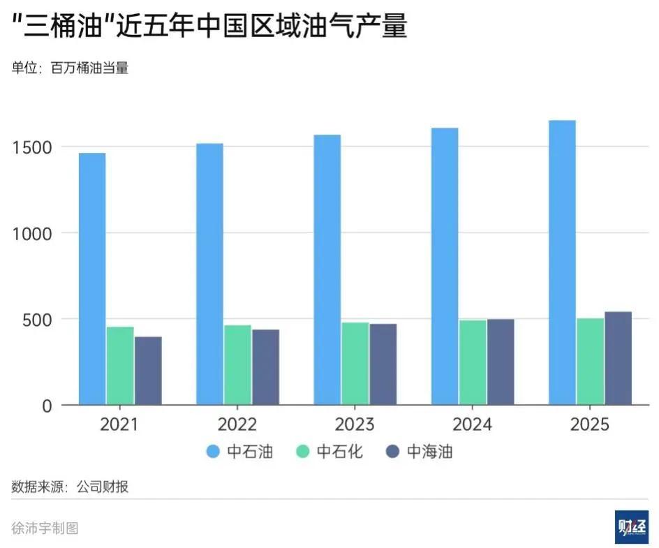 根據三家公司的財報,中石油的油氣產量從2021年的14.57億桶油當量,增長至2025年的16.47億桶;同期,中石化從4.5億桶油當量,增長至4.99億桶;中海油從3.92億桶油當量,增長至5.37億桶,已經超過中石化。