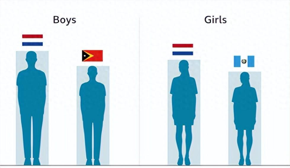 從全球範圍來看,19歲人羣平均身高最高的國家集中在北歐和中歐,其中荷蘭以男性183.8釐米、女性170.4釐米的平均身高位居前列,黑山、丹麥、冰島等國家的人羣身高也處於較高水平。而身高較低的區域主要集中在南亞和東南亞,東帝汶男性平均身高爲160.1釐米,危地馬拉女性平均身高僅150.9釐米,全球身高差異顯著。