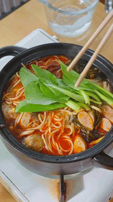 像是丸子這種不太愛熟的食材先放,煮個2分鐘吧,再把海帶絲、豆芽、幹豆腐絲和香腸片這些東西都放進去。