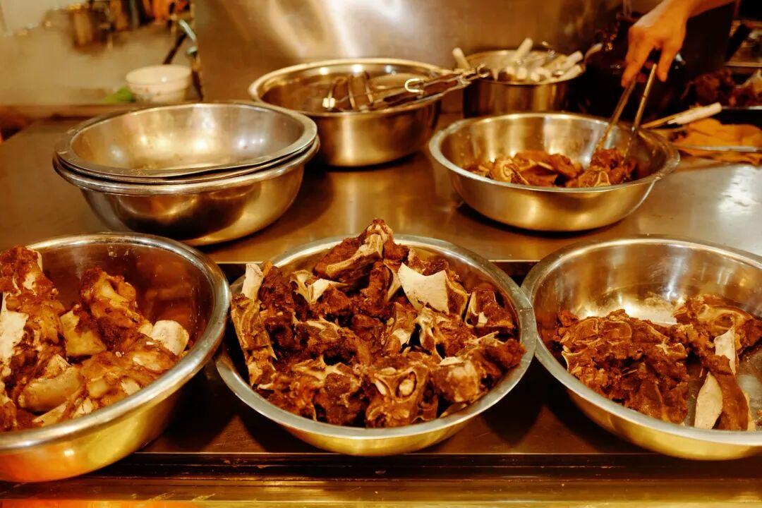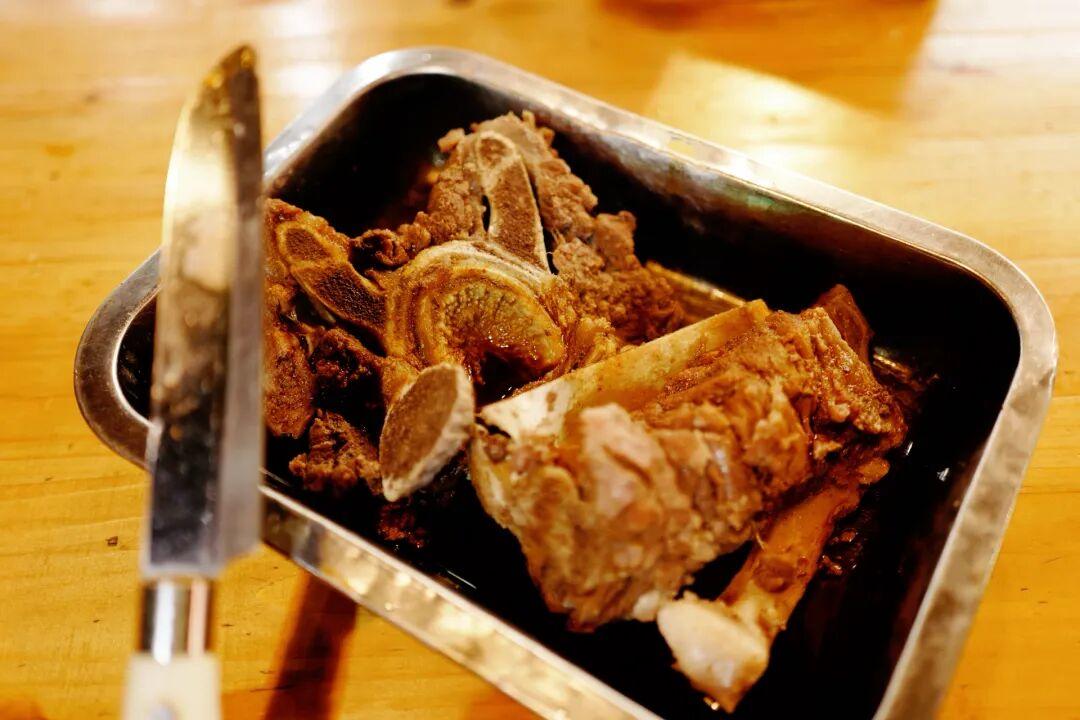 熬煮了一整天的牛骨,牛蠍子、牛腿骨、牛仔骨、牛筒骨……在攤位前依次排開。點好單後,會把牛骨加熱一下,再淋上店裏的祕製醬汁。