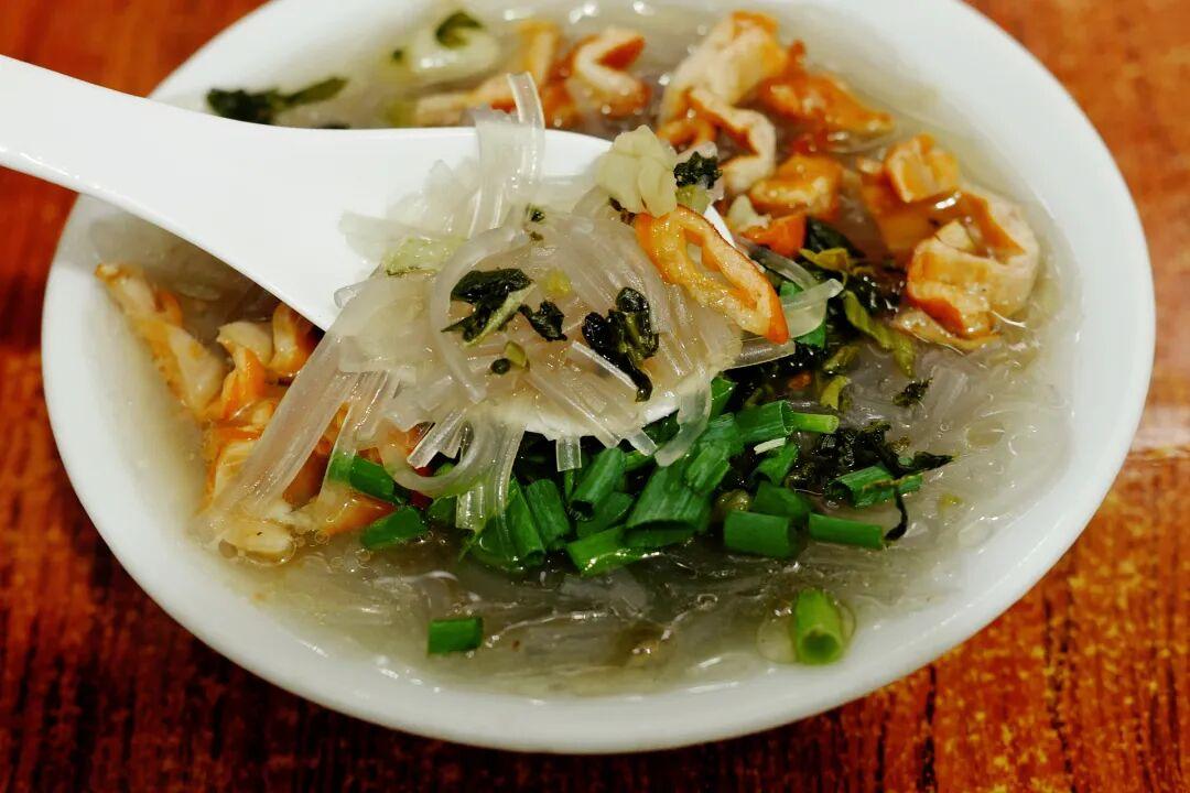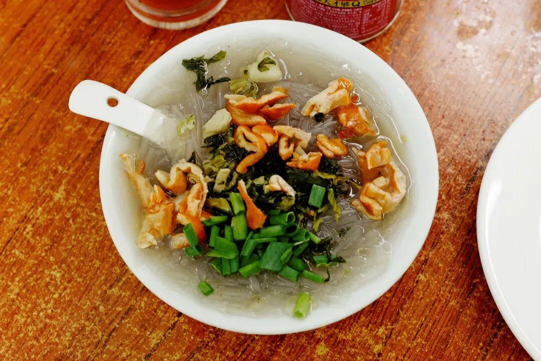 粉扣有點類似於地瓜粉,煮到半透明狀,喫起來是又軟又脆的口感,還沒好好感受味道就滑進肚子裏了。