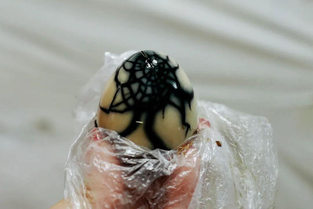 第一次見到蜘蛛網狀紋路的茶葉蛋,還是黑色的,看起來很黑暗料理,那更得嚐嚐了。不過喫起來和普通茶葉蛋無異,但還蠻入味的。