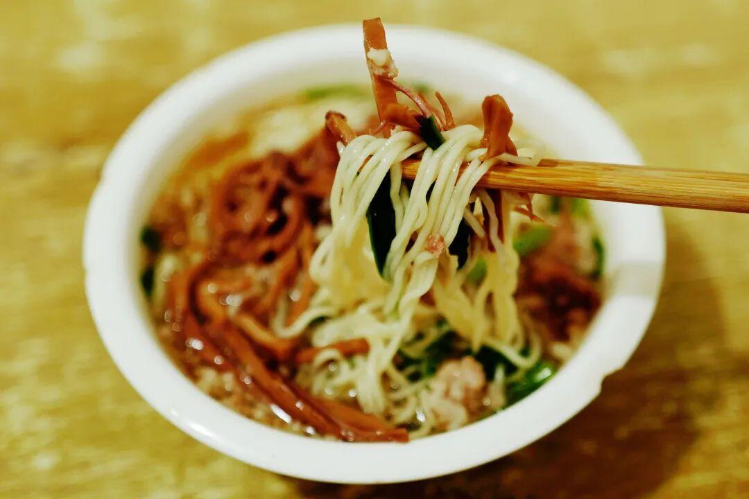 福安拌麪的靈魂之一面條,必須是這種彎彎扭扭的手工面。這種面喫起來外層軟滑,內裏卻藏着幾分倔強的韌勁,嚼起來紮實又充滿面香。