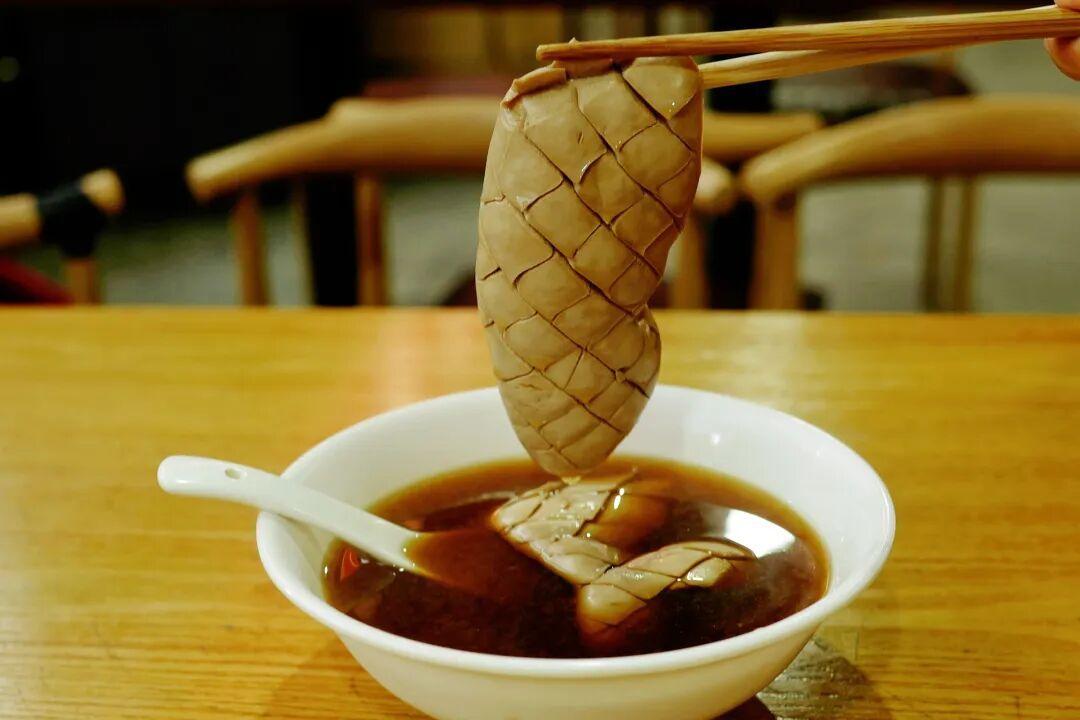 湯底是用豬大骨、魷魚乾、香菇等其他祕製食材慢熬出來的,湯底色澤清亮,但味道卻是特別的濃郁醇厚,每一種食材的精華都毫無保留地融入到清湯中。