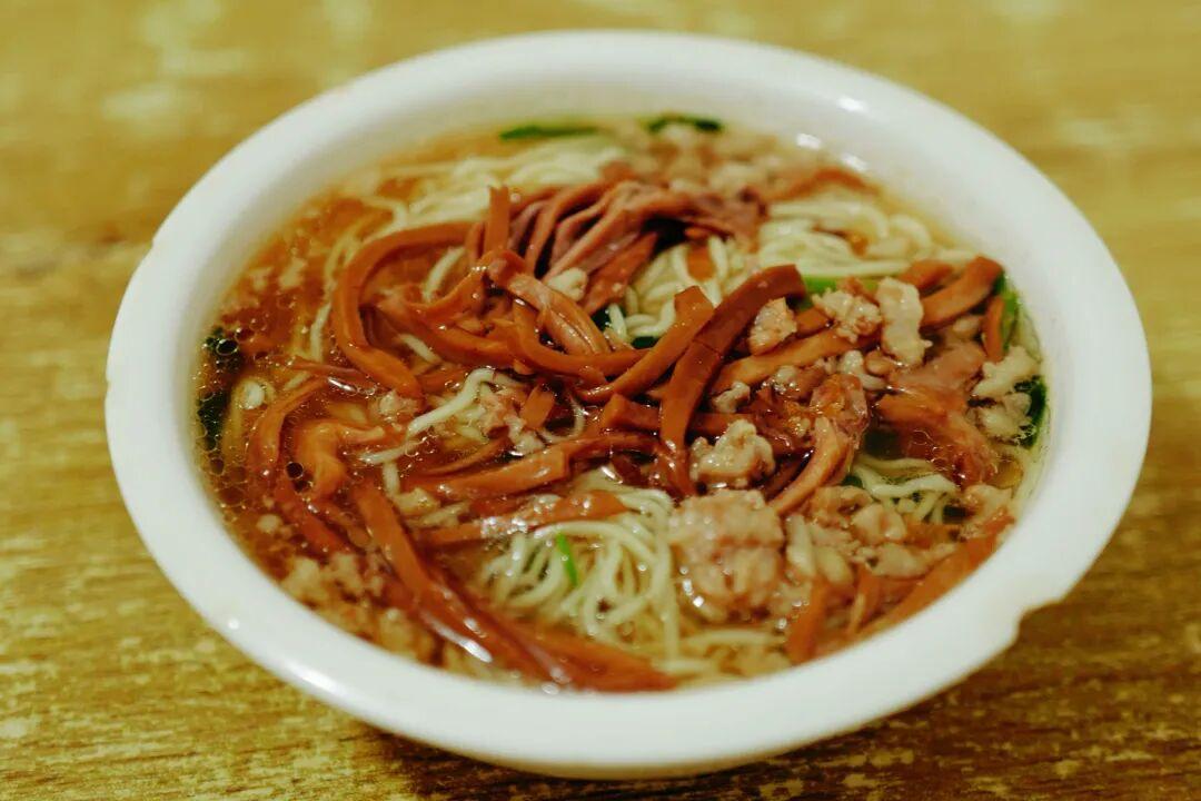 8塊錢一碗的清湯麪,比我想象中的可豐富太多了,面上鋪滿了魷魚乾和鮮肉沫。