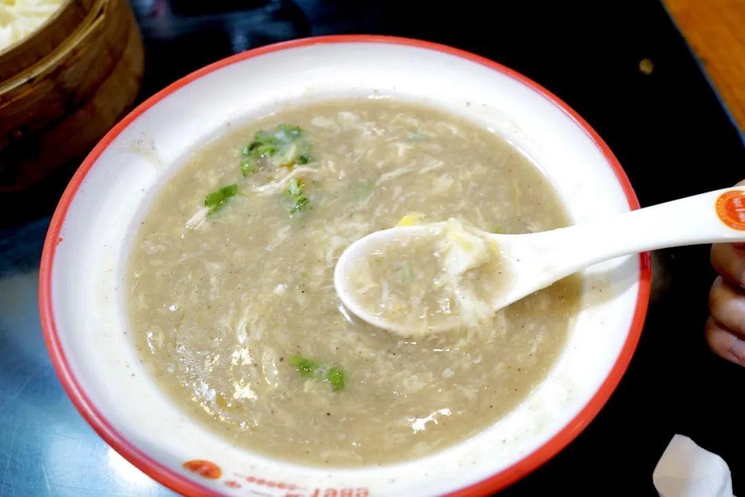 雞絲糝湯也是店裏特色,像是加了胡椒的粥,黏稠的一碗。湯層級豐富,入口綿密帶着點顆粒感,喝完胃是暖的。
