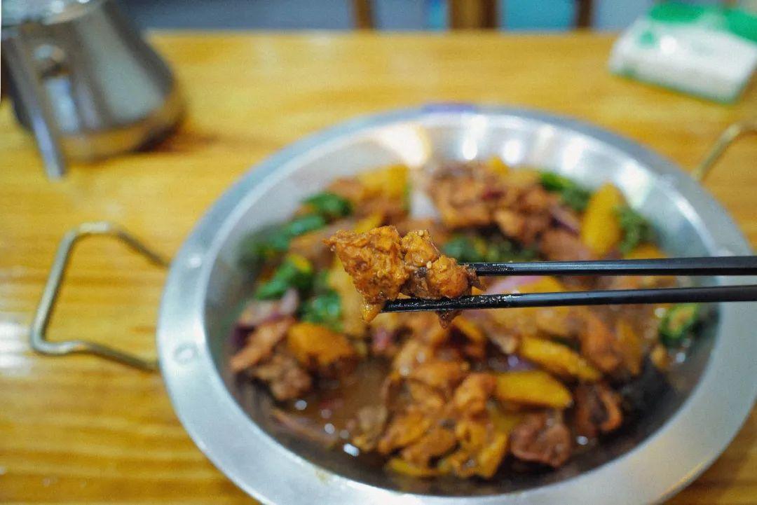 點菜的時候可以選擇乾的還是多汁帶湯的,我選了偏乾的,上來很大一盤,半隻雞的量。雞肉經過炒制後外皮微脆,裏面的肉還是嫩的,帶着汁水,一點不柴。