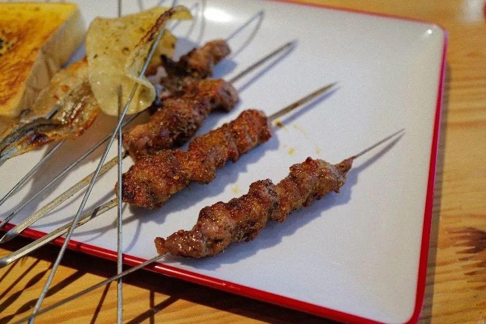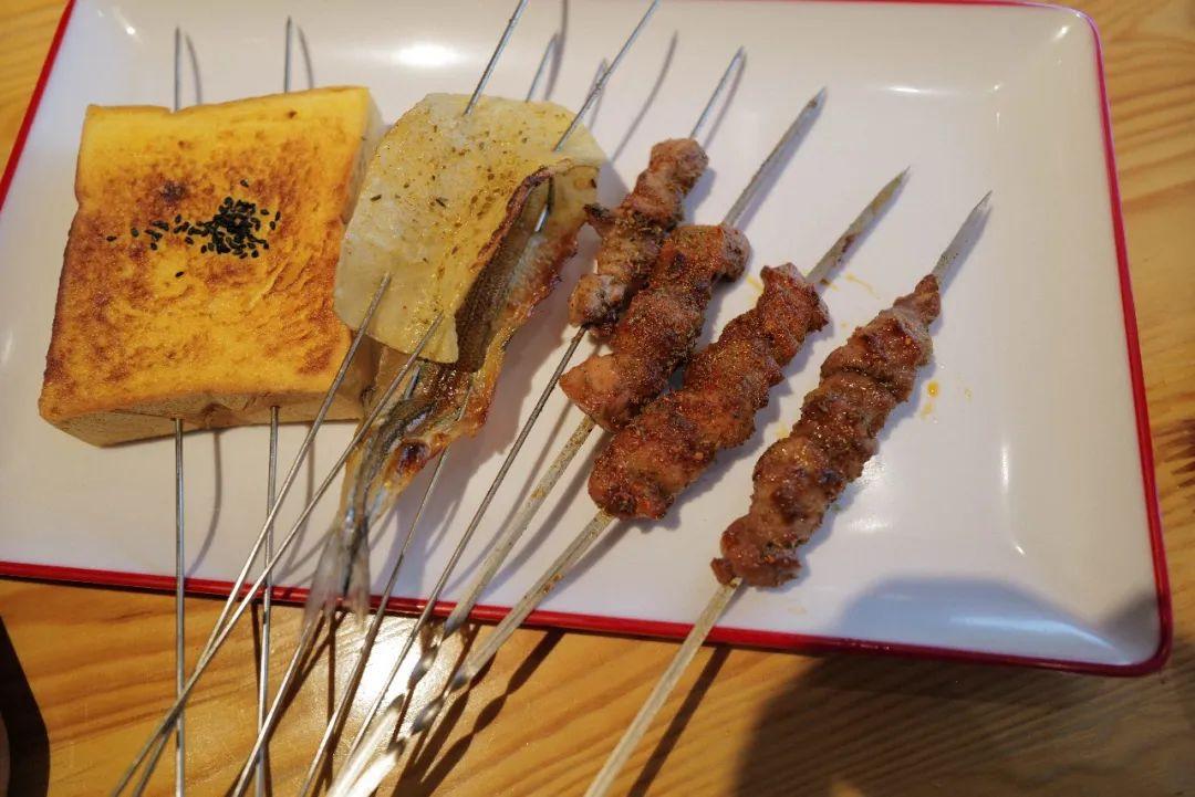 烤串端上來的時候還在滋滋作響,串串上的油脂與醬料相互融合,形成一層誘人的焦糖色。尤其是肉筋串,經過炭火的洗禮,外層焦脆,內裏鮮嫩入味,真香!