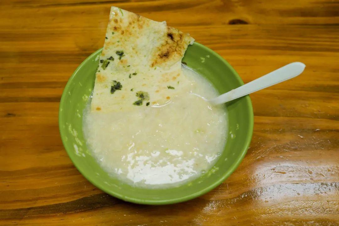 試了店裏的糝湯和麪餅,鹹口的糝湯並不稠,有點稀,裏面帶着燕麥。單喝湯的話調味偏重,搭着清淡口的麪點會好些,一餐下來更多是家常的味道。