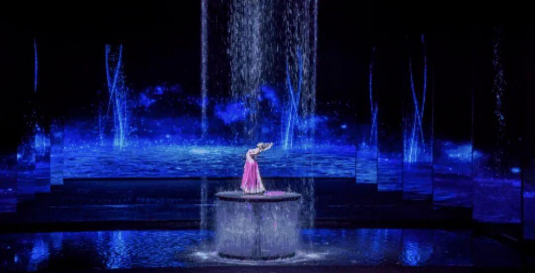 通過一字雨簾與全息投影的結合,將水光瀲灩的宮廷美學推向極致。演員在雨幕中翩翩起舞,衣襬濺起的水花與投影中的宮殿倒影相互交融,視覺效果很是震撼。