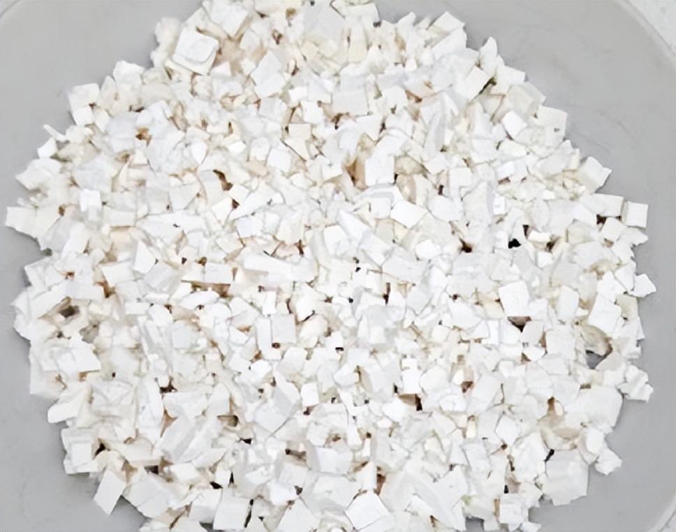 2、老豆腐切2cm塊,同沸水焯水2分鐘(去豆腥+筋實),過涼水瀝乾,切黃豆大小顆粒。