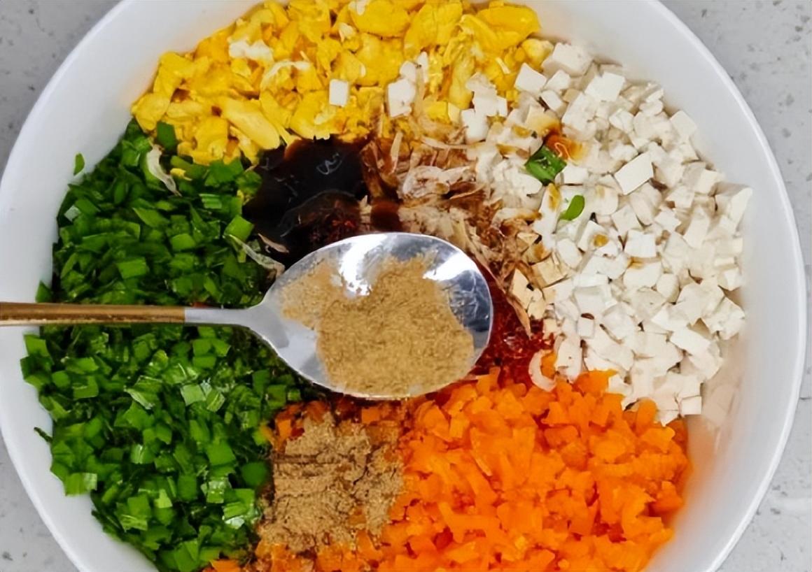 5、把胡蘿蔔末、豆腐粒、韭菜碎、涼雞蛋碎倒入大碗,先不混合(避免提前出水)。