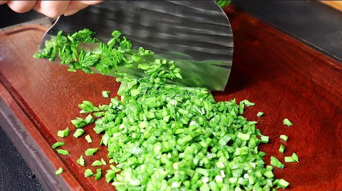 2、韭菜一定要選這種嫩一點的韭菜,頂刀切成粒兒,然後盛到盆裏。