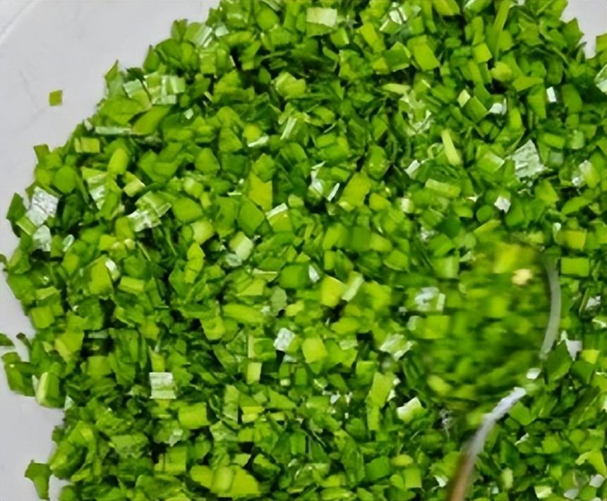 3、韭菜洗淨徹底晾乾(掛通風處/廚房紙擦乾),切0.5cm碎末,加1勺熟油拌勻(油封切口,不出湯)。