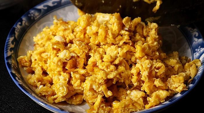 4、雞蛋打散加少許鹽,熱鍋多油快速劃成細碎蛋花,盛出徹底攤涼(熱雞蛋會燙出韭菜水)。