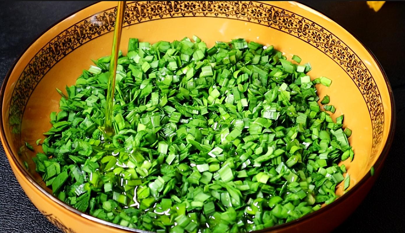 3、不出湯的關鍵啊,就是加入適量的食用油,然後像我這樣攪拌均勻,把韭菜鎖住水分。