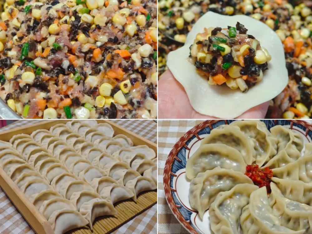 1、木耳溫水泡發切碎;蓮藕去皮切丁泡水;玉米剝粒;胡蘿蔔、香菇切丁;蔥切花;豬肉絞成餡。