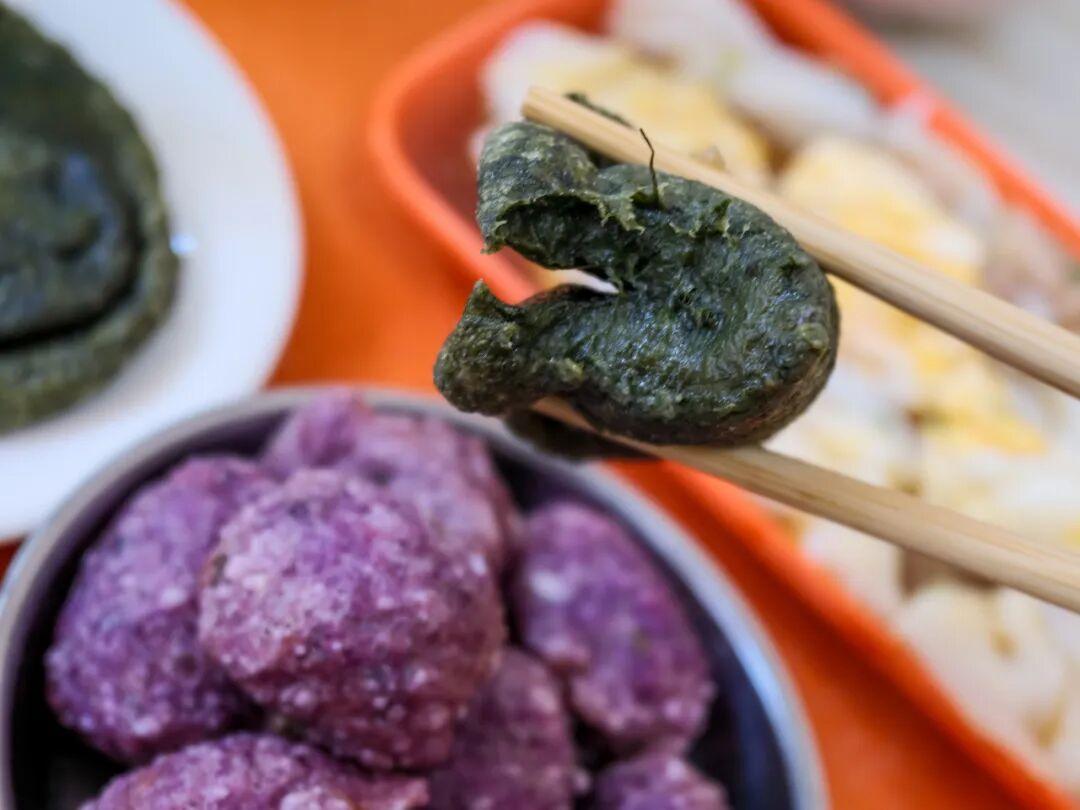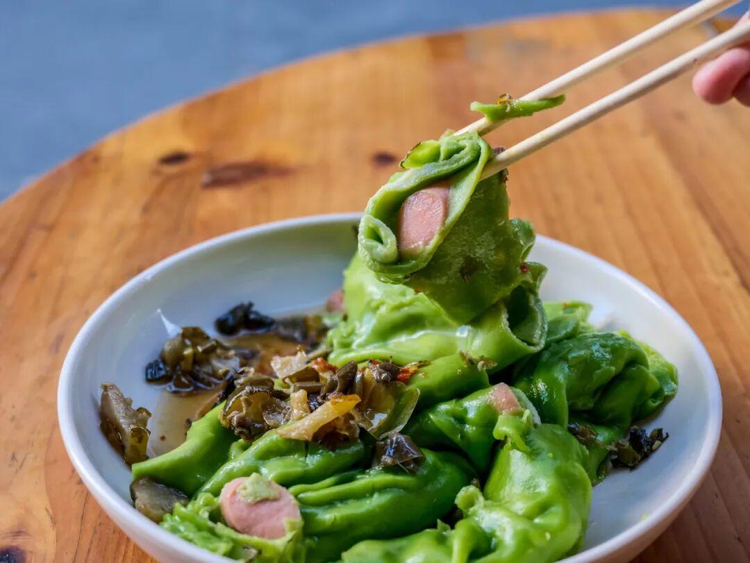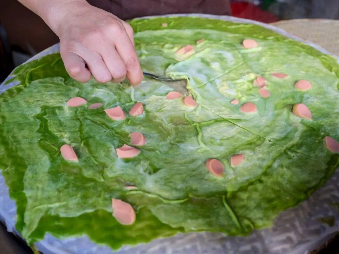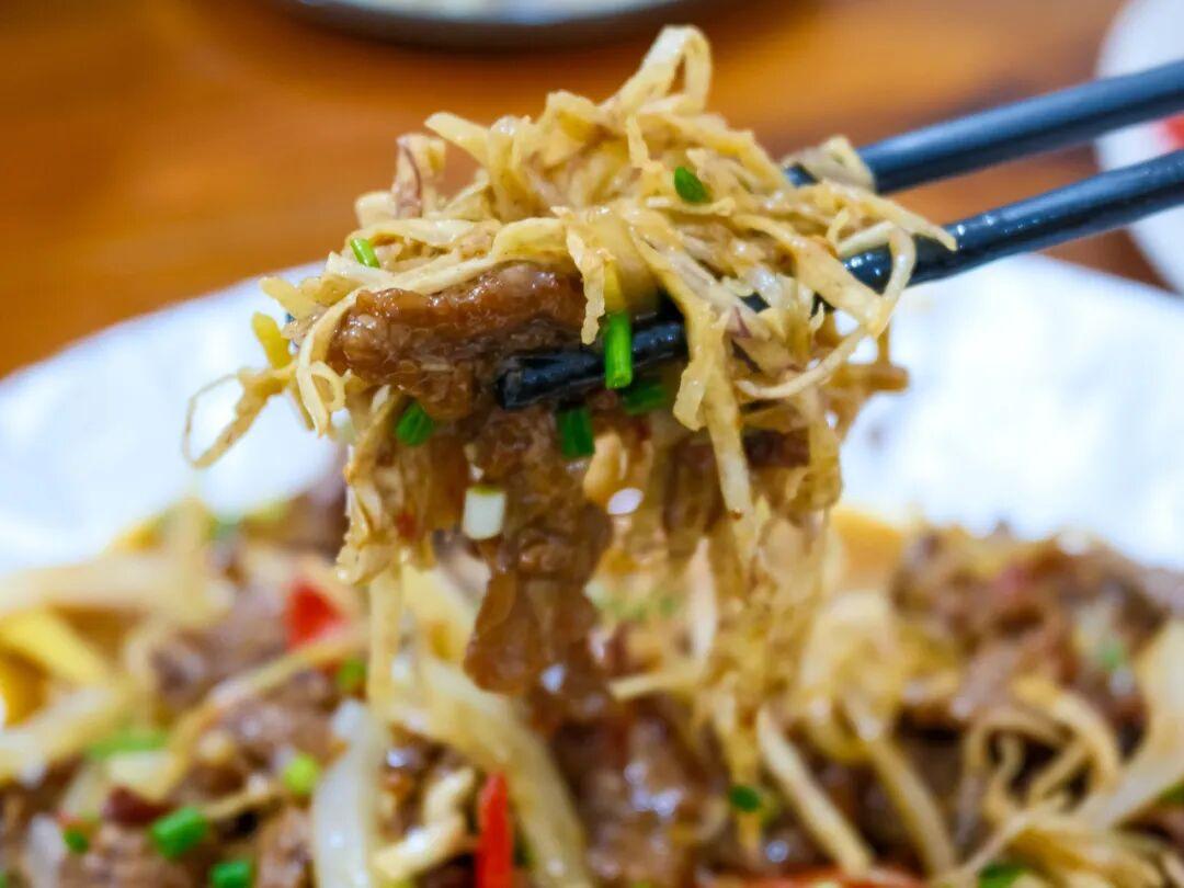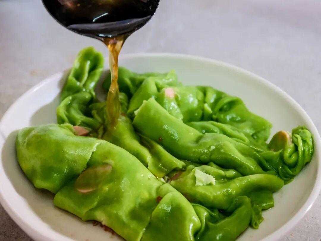 燙皮形似腸粉,味道也大差不差,區別是燙皮會稍微厚一些。因爲米漿里加入了韭菜汁,燙皮整體呈綠色,喫起來倒沒什麼韭菜味。料汁的調味比較清爽,加一勺店家自制的鹹菜,風味加倍。