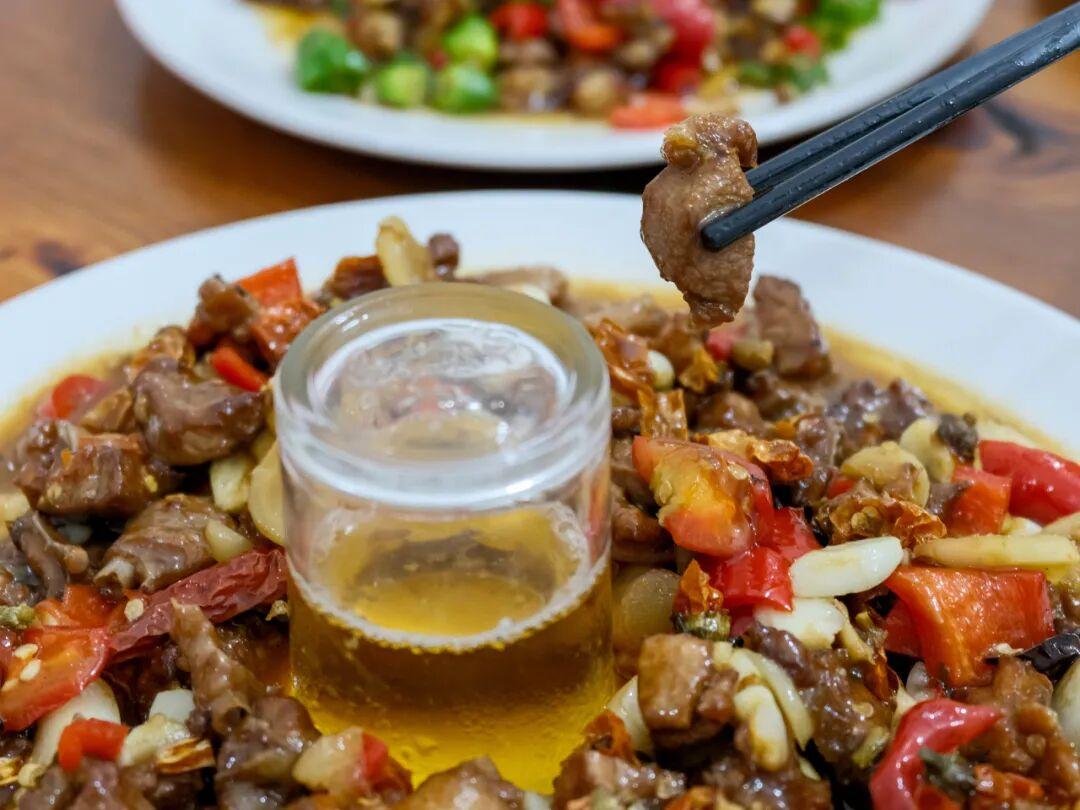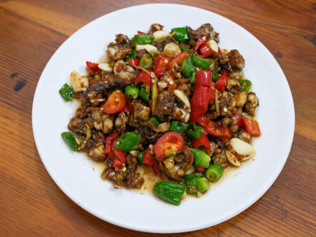 田雞切得小塊,用了青紅兩種辣椒爆炒,調味肯定是重的,方便入味。喫田雞的樂趣在於嗦骨,浸入肉裏的鮮和辣絲絲縷縷轉移到舌尖,實在上頭!