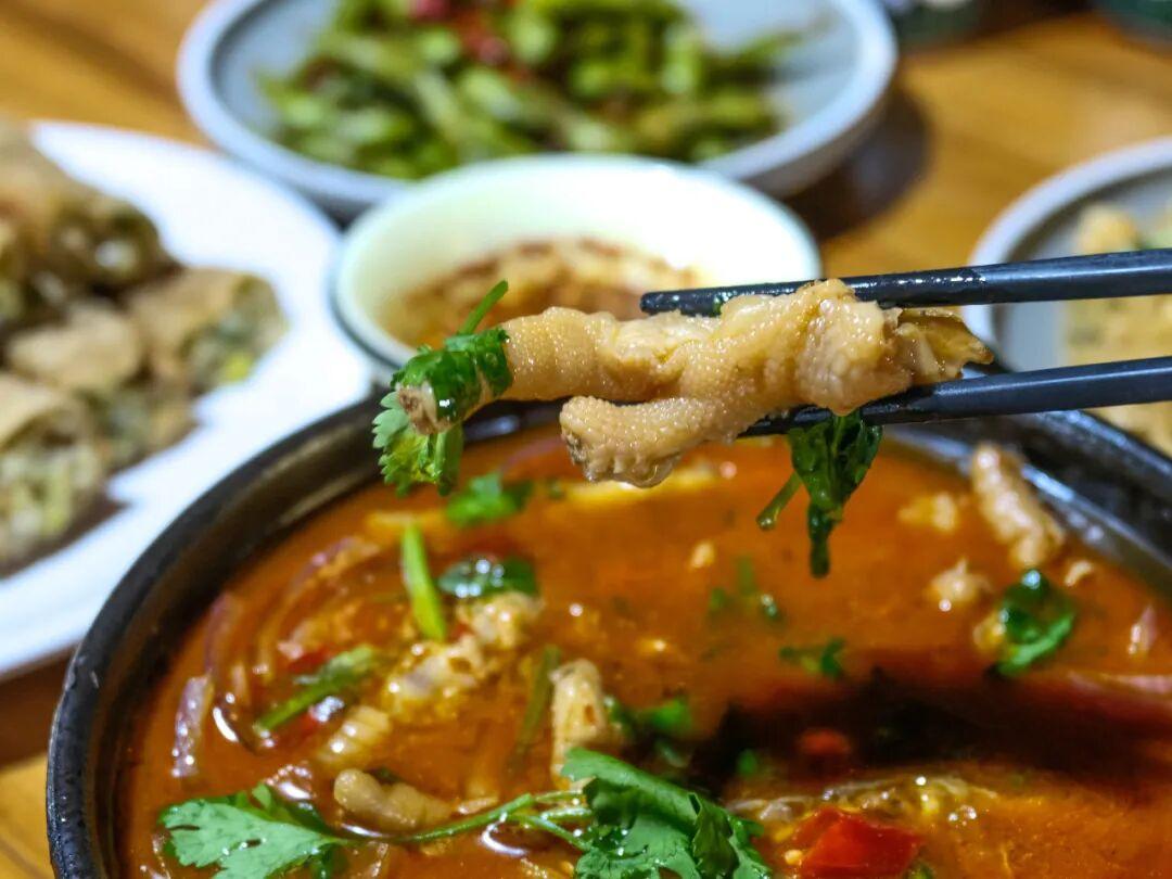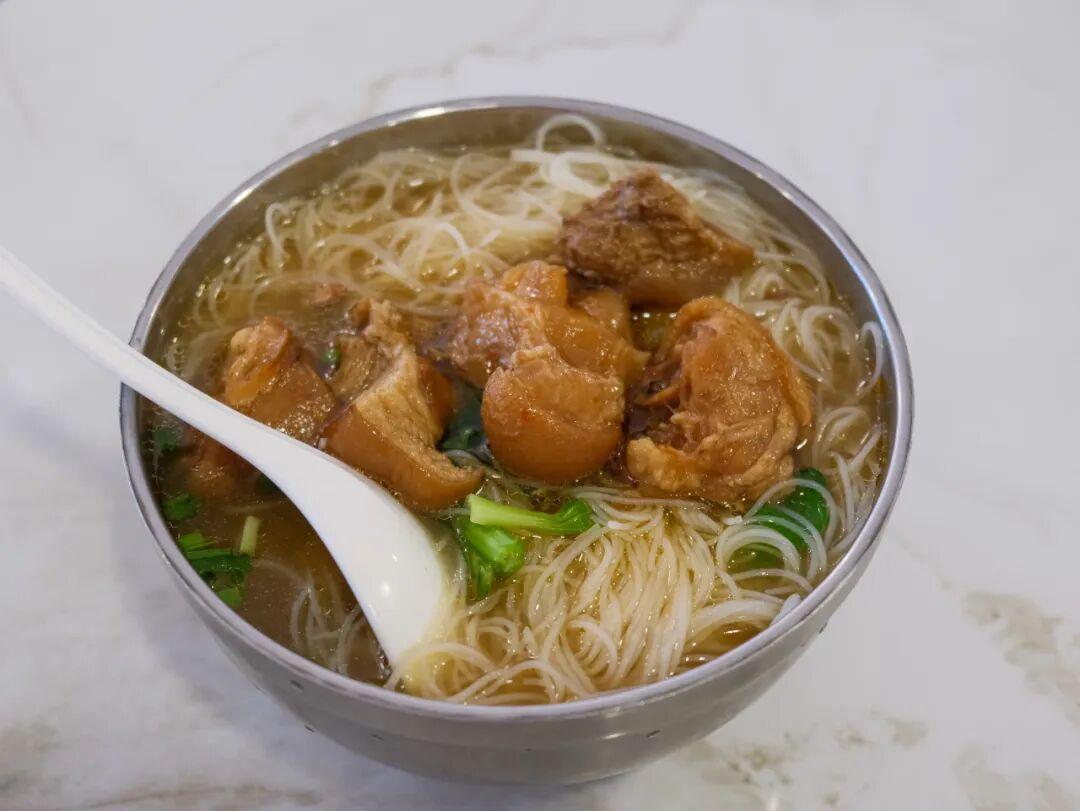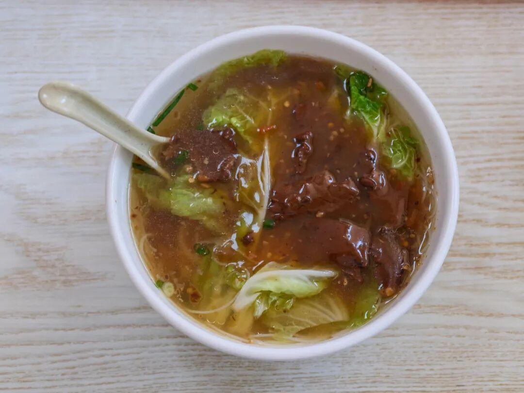 再次感慨,在這個通脹時代,只有小城的物價一如既往熨貼,讓人安心。童記的素湯粉售價5元,可以免費加小料。我點了10塊錢的辣豬足粉,很重金了。