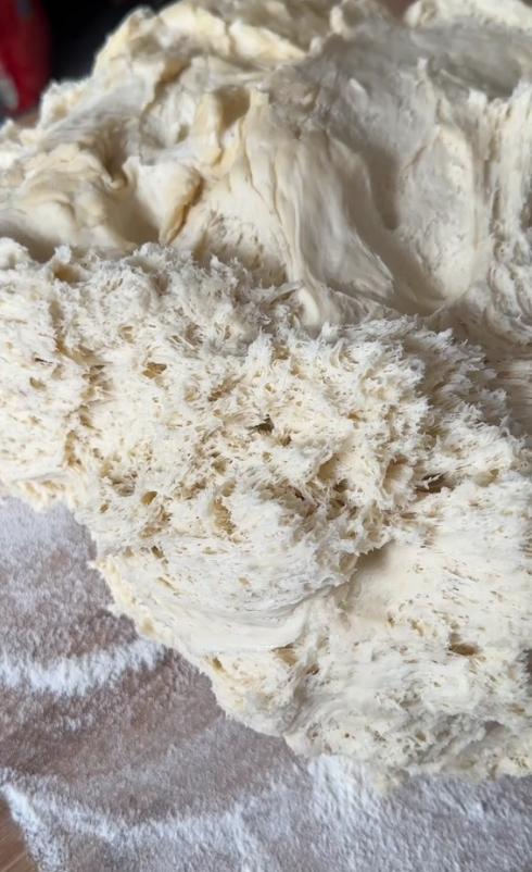 5、發酵好以後,全都是密集的氣孔,黏手,並且有酸香味。這一步其實是增加酵母的數量,讓下一步發酵更快,也讓饅頭更鬆軟好喫。