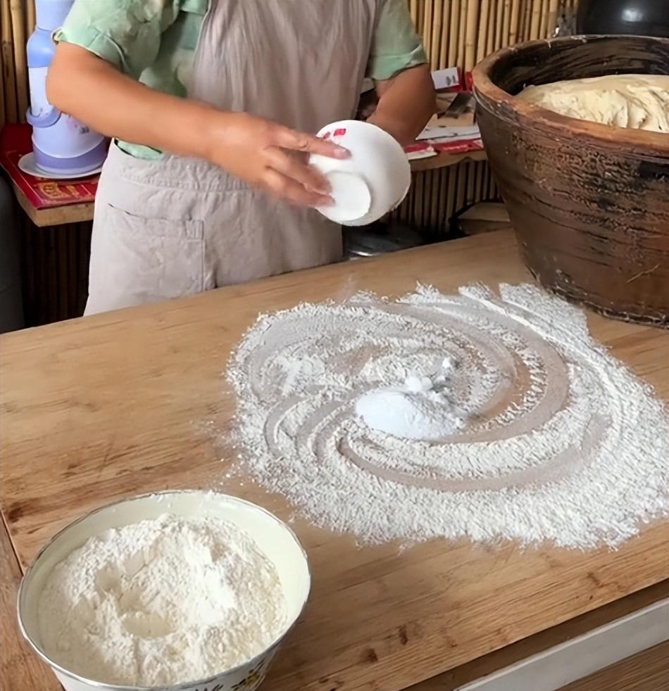 10、案板上灑一些乾麪粉,抓上一把鹼面(食用鹼)
