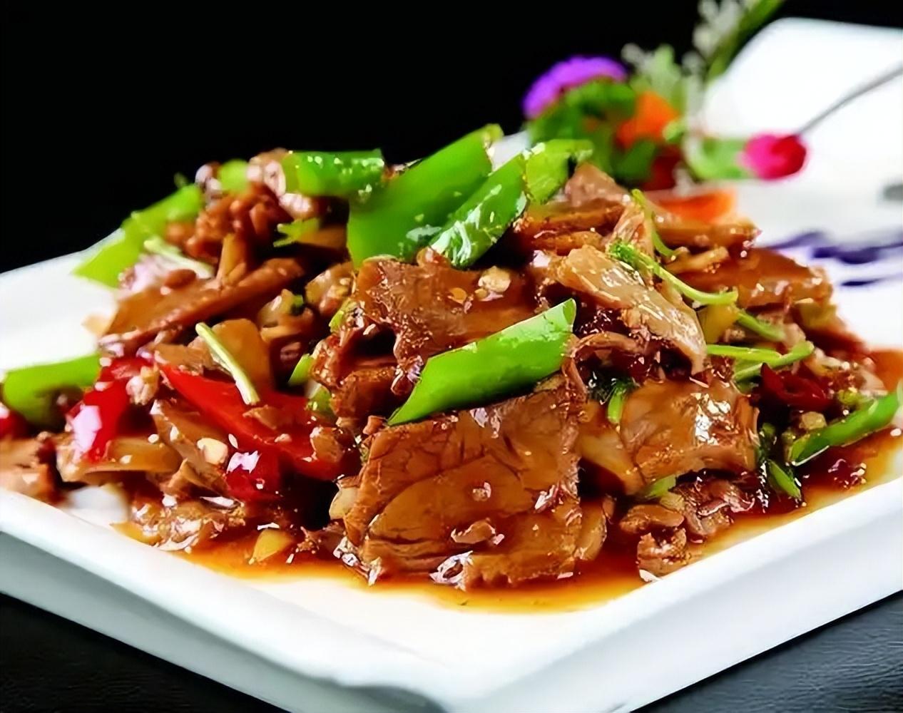 5、鍋內留50克油,下入冬筍片和大蔥加鹽煸炒,隨即倒入滑熟的羊肉片,衝下兌汁簸炒幾下,淋香油,裝盤即成。