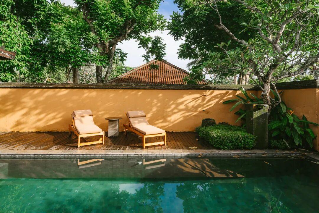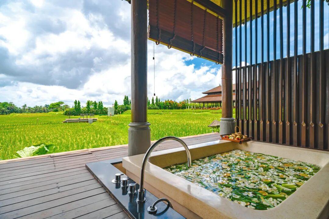 我這次入住的是單臥室泳池別墅,景觀非常棒,推門就是稻田,配上度假風的半戶外浴缸,chill又不受打擾,最有可能的觀衆是樹上的松鼠。