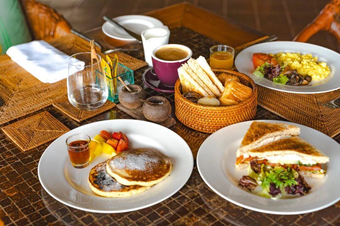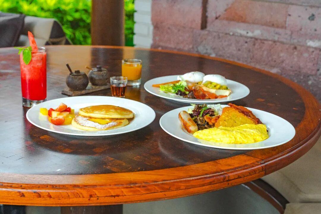 早餐是點單的形式,選擇比較豐富,有西式和印尼本土風味的食物。我推薦滑蛋、香蕉鬆餅、印尼海鮮炒麪,還有一款當地的姜味果汁飲料,小小一杯,比咖啡提神百倍。