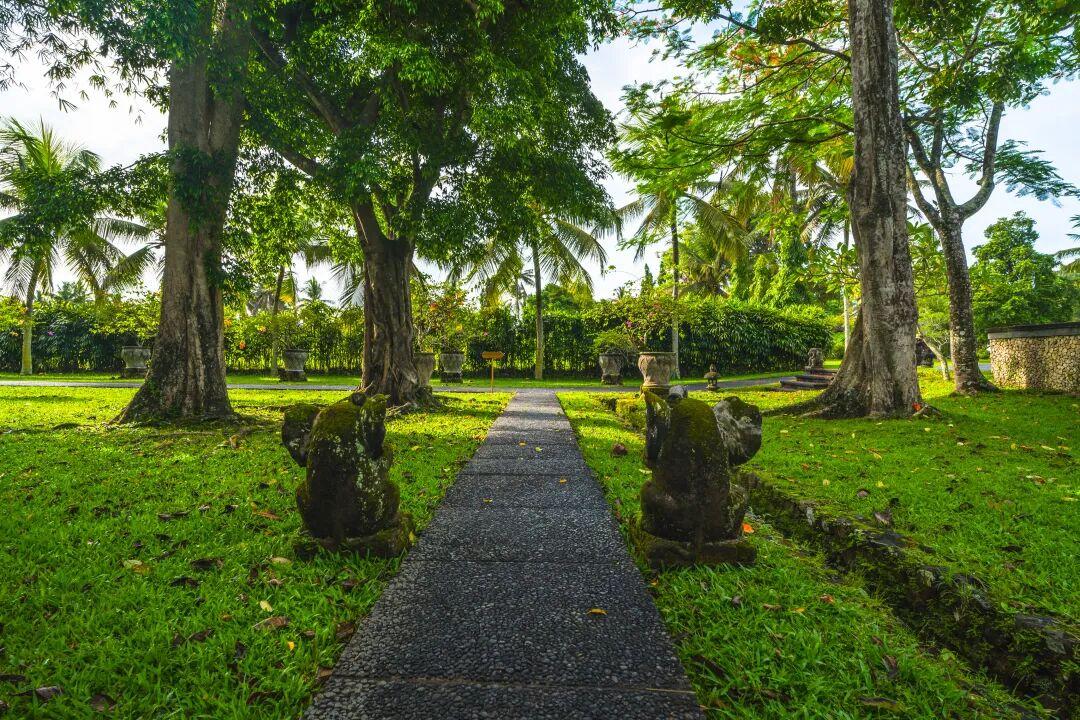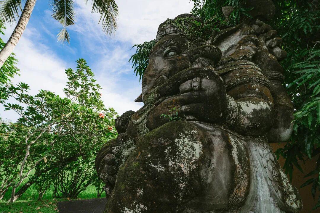 整個度假村的面積相當於7個標準足球場那麼大。走進這樣的“大戶人家”,映入眼簾的除了充滿禪意的巴厘島式建築,還有綠油油的草地、盛放的睡蓮、高大的椰林、蜿蜒的小路,以及神聖的石刻雕塑。