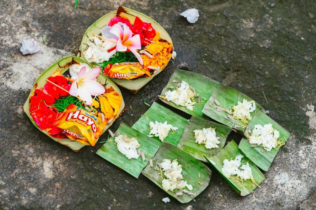 每天他們都需要沐浴焚香來供奉神明。如果你看到路邊這些芭蕉葉盛放的鮮花和食物,千萬不要踩到了,這是他們給神明的供養。