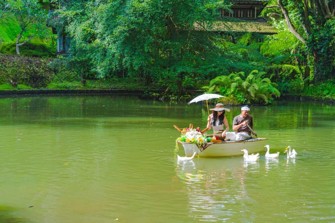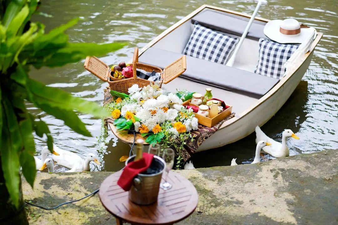 除了泳池,我最喜歡的這個小池塘。【船上下午茶】宛如一腳穿進了《唐頓莊園》,搖着小船在池塘裏盪漾,周圍會有一羣鴨子陪伴,當然,你需要分它們一些麪包。