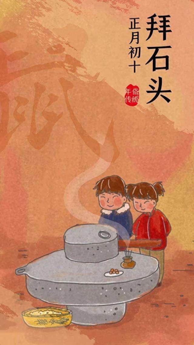 “初十磨礅不作聲,一年家宅萬事興。”正月初十,有個獨特的民俗節日“石頭節”,爲石頭神生日,也稱爲稱“石磨日”、“十子日”、“石不動”等,這天老輩人不讓動石頭、不碰石具。