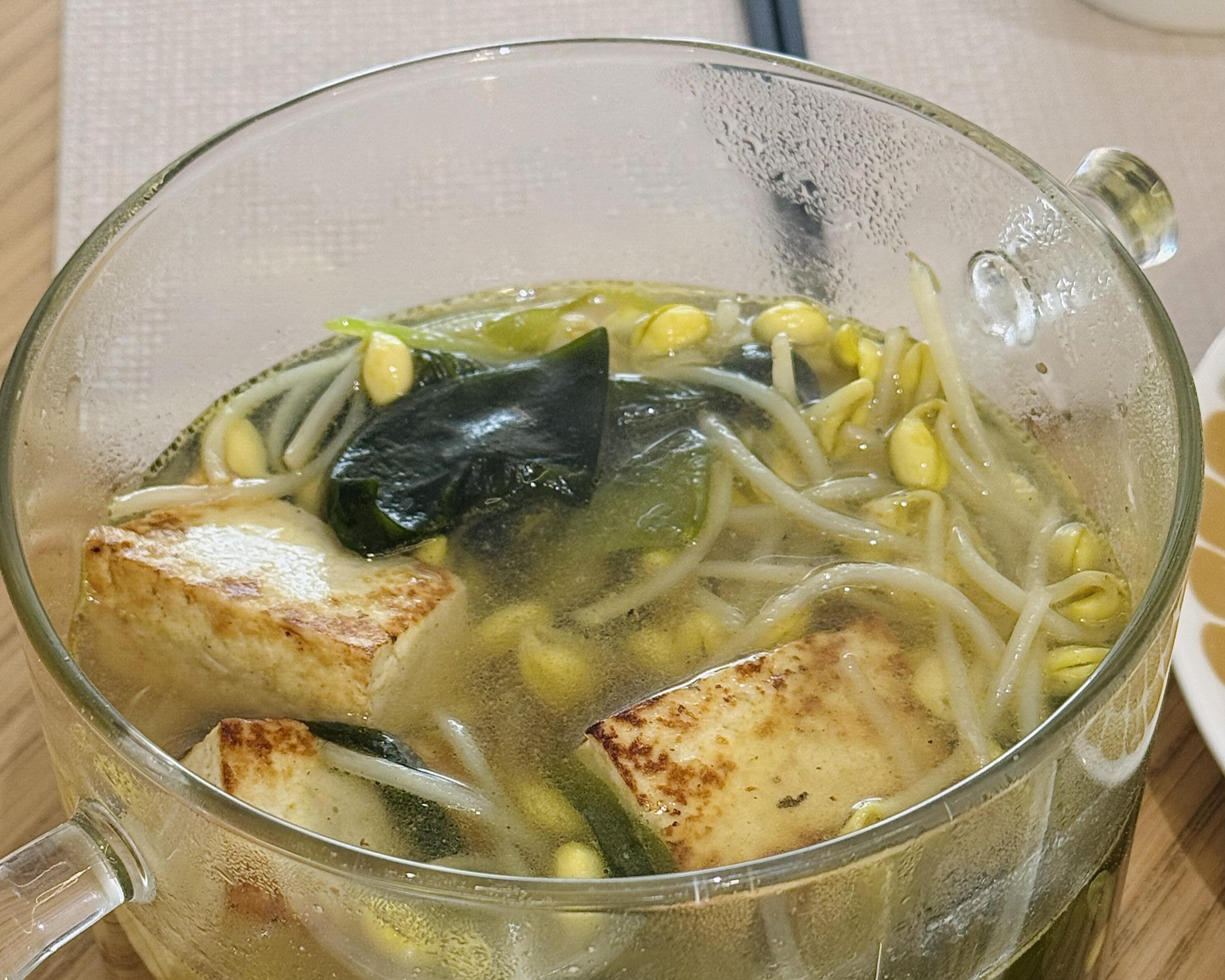 少量橄欖油煎好豆腐,簡單炒一下豆芽,倒入開水,放白胡椒粉,特鮮醬油少許,鹽少許,煮沸騰,放入海帶苗,煮三分鐘,最後放香蔥起鍋,雖然是素菜,但很清爽鮮美。