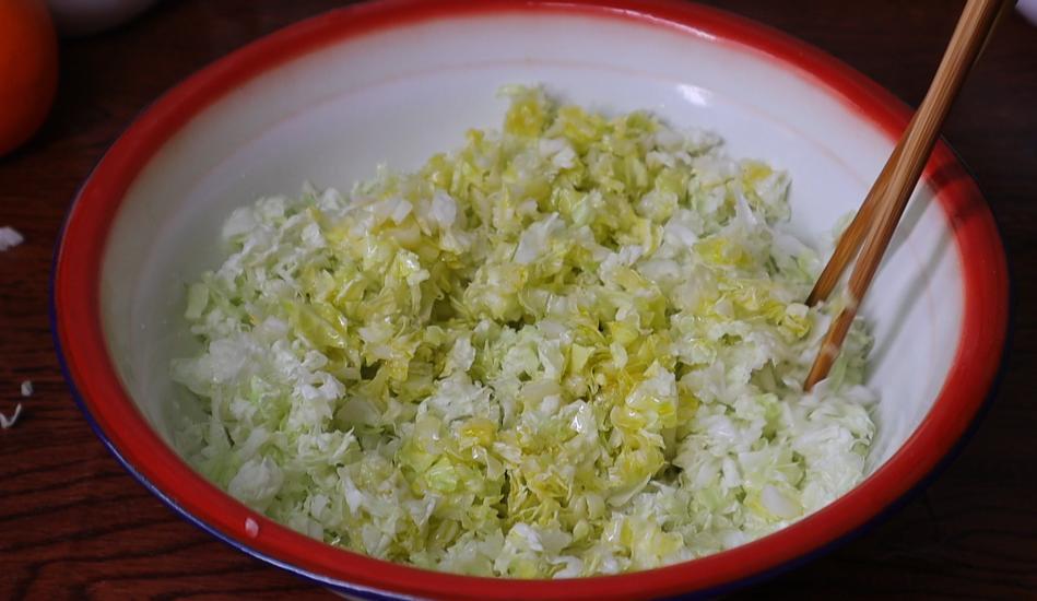 3、接着準備白菜切碎,白菜我們只要葉子,切好白菜記住不要加鹽,只需要加一勺油,這樣才能鎖住水分,包出的餃子不會出水。