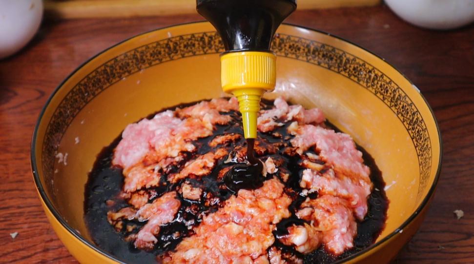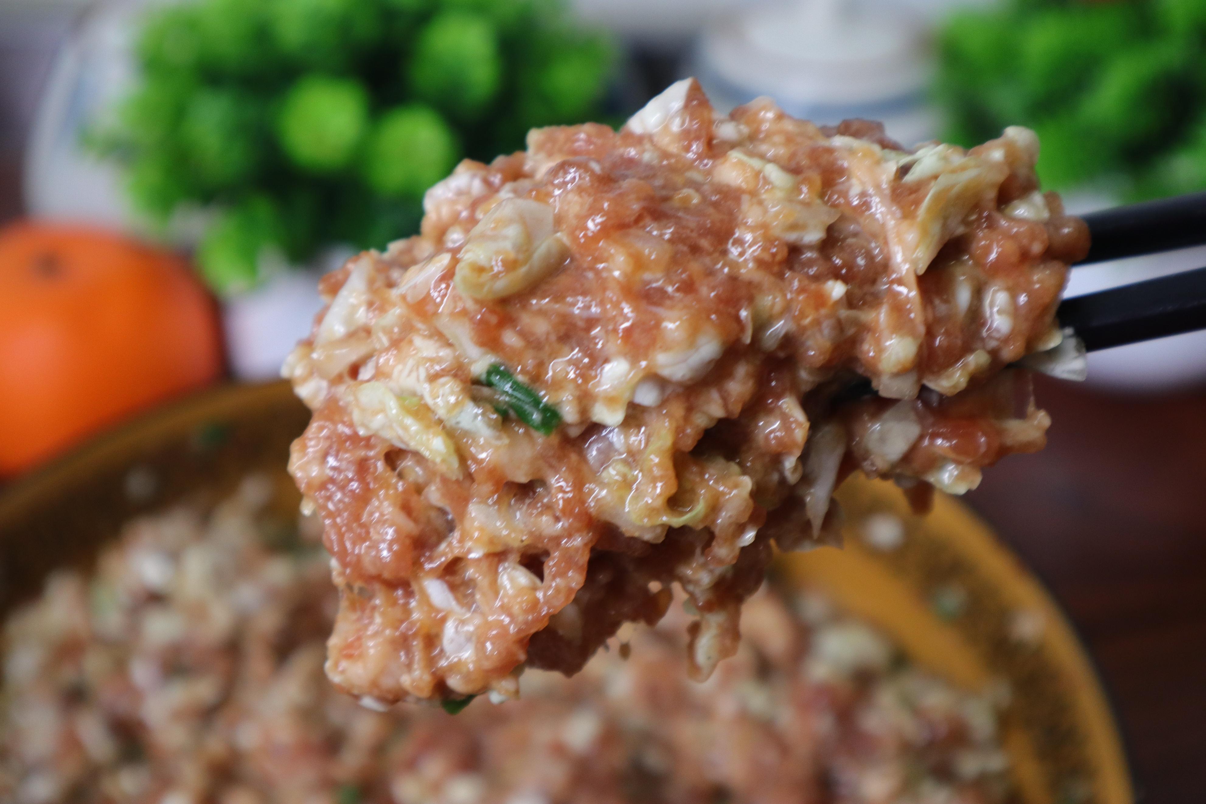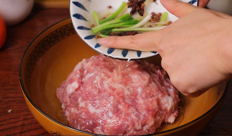 4、泡好的蔥姜水分三次倒入肉餡,然後充分抓均勻,讓肉餡吸飽料水,這樣不僅去腥,而且餃子多汁。