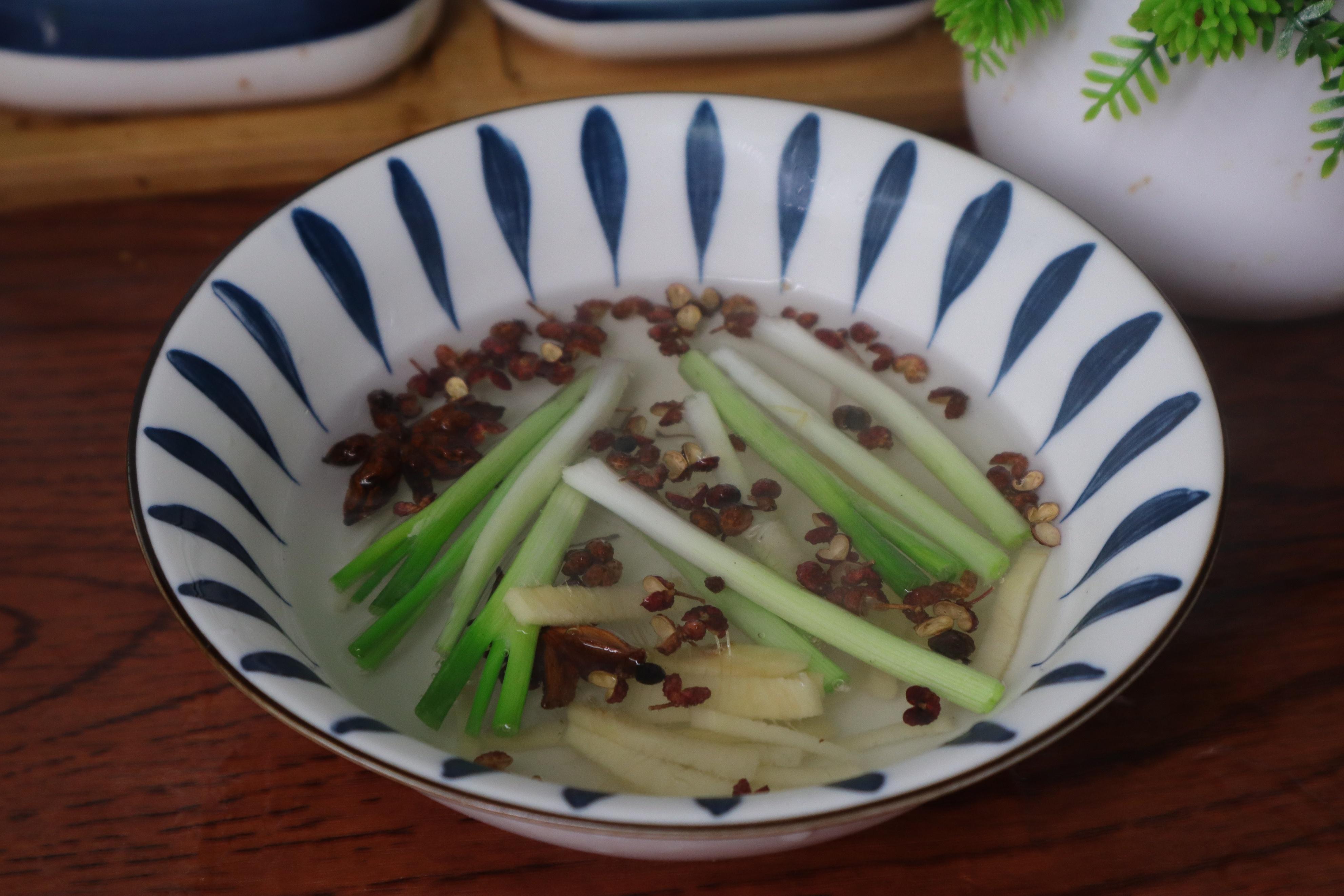 2、小碗裏放蔥段,生薑絲,花椒粒,八角,倒入適量的開水,給它浸泡上5分鐘。
