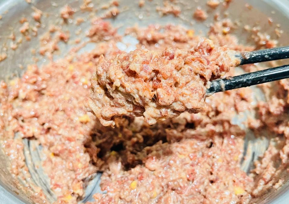 3、餡料攪拌均勻之後,分次在加入少量清水,繼續順着一個方向攪拌,讓牛肉充分吸收水分,這樣喫起來纔不會柴。