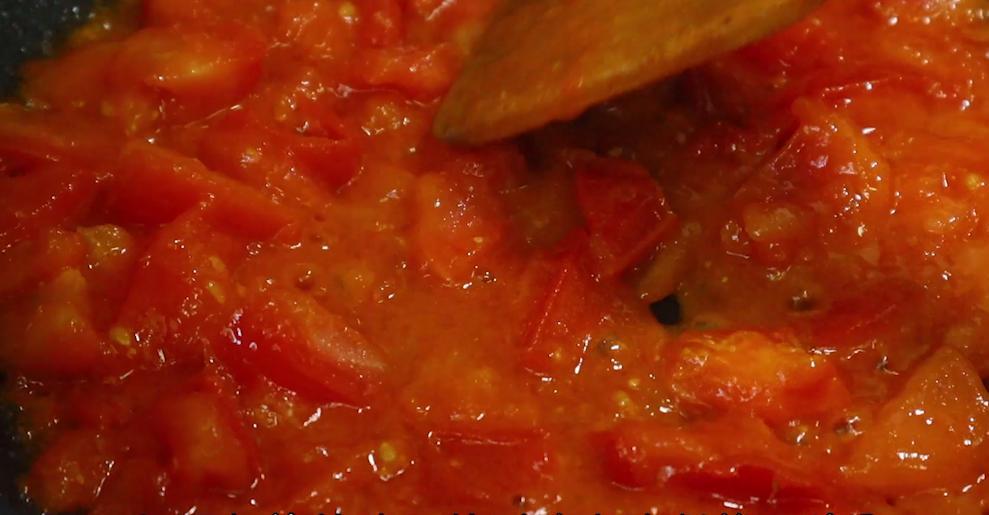 4、不用洗鍋,直接倒入西紅柿塊翻炒,加少鹽,西紅柿更容易出汁,大火不斷翻炒,可以用鏟子壓一壓,,把西紅柿炒碎,炒到汁水濃稠就可以了。