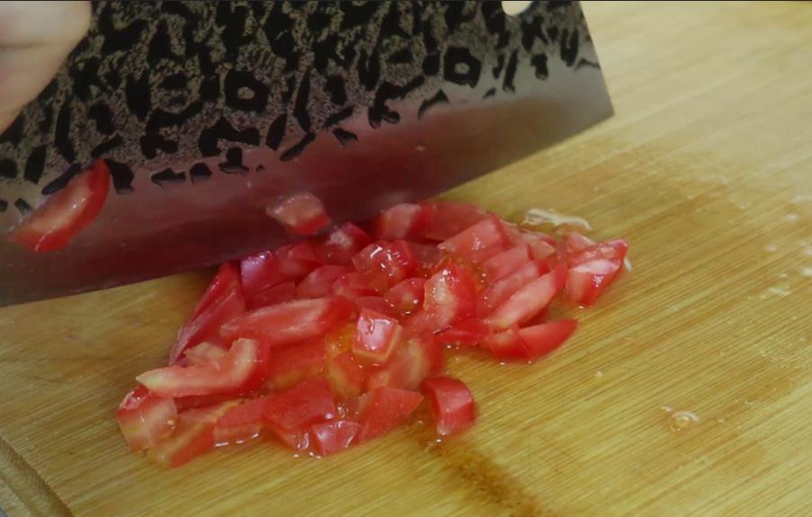 1、首先準備西紅柿不用去皮,把根部切掉,,然後再把它切成大塊,再準備一個西紅柿將它切成小丁備用。