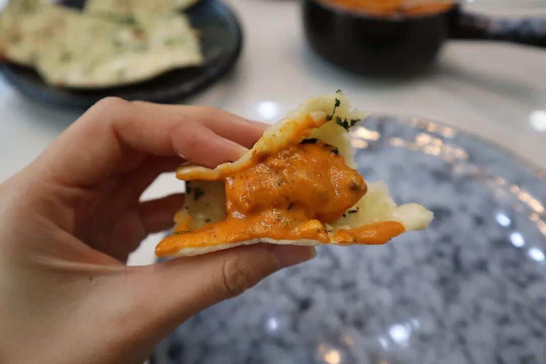而蛋黃醬裏面加入了蘿蔔胡蘿蔔和奶油,風味濃郁帶點微甜;香菜醬則很清爽,裏面還有新鮮的番茄、黃瓜、洋蔥。舀一勺到麪包裏,口感層次分明,是很不一樣的味蕾體驗。