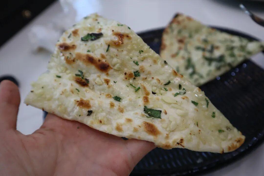 我發現,中東菜的餅系列是真的多,印度也不例外。我在菜單上琳琅滿目的餅單裏選了某書好評最多的“大蒜餅”。果然沒有讓我失望。