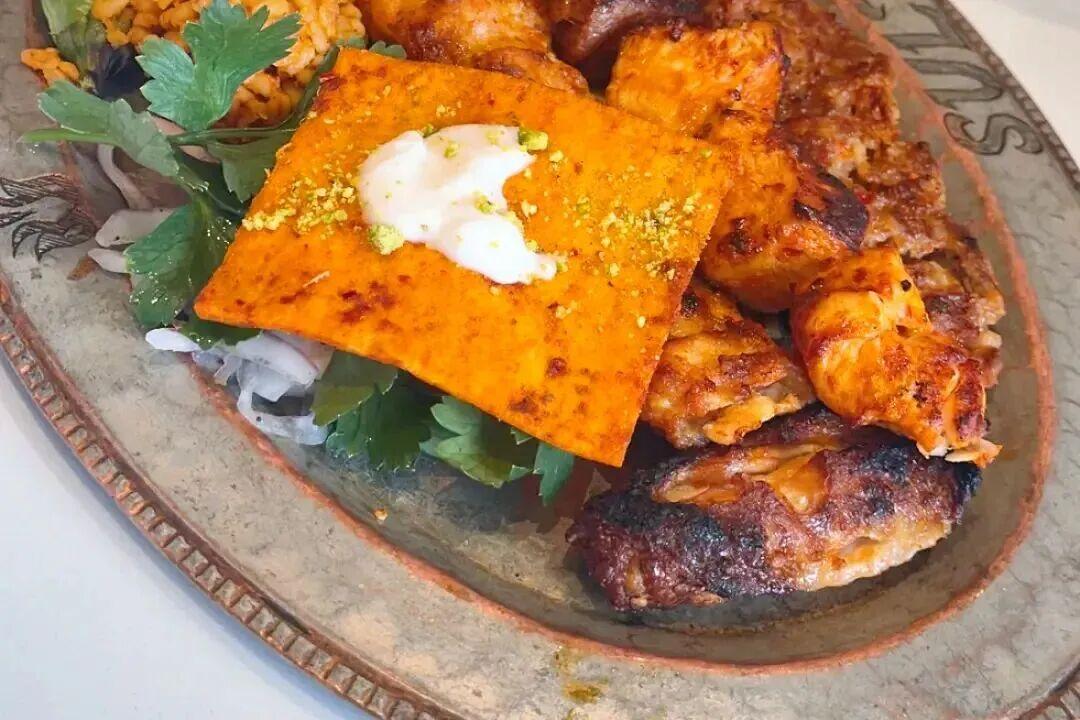 先是一道混合拼盤烤肉,兩條色澤金黃、邊緣微焦是羊肉串和雞肉串,肉條是被孜然、薑黃、肉桂、黑胡椒醃製過的,外殼焦香酥脆,內裏鮮嫩多汁。不過羊肉會帶有一絲絲羊羶味,應該是山羊來的,不喜羊肉的朋友不要點。