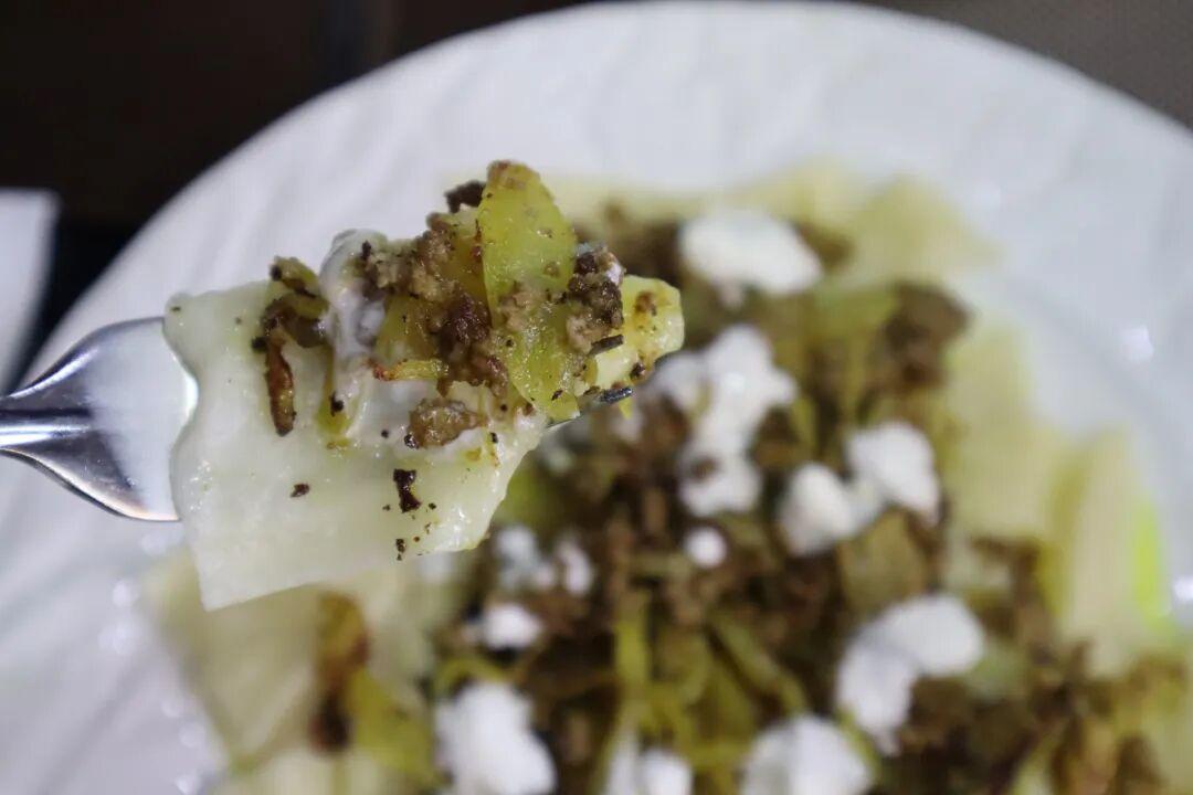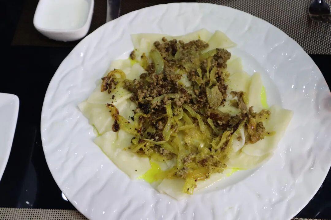 面片質地柔韌卻富有彈性,肉醬帶有一股油煎過後的焦香。鋪上一層酸奶拌勻開來,面片與濃稠滑順的高加索酸奶相互交融,酸味與焦香的油膩感一下子就得到了中和。
