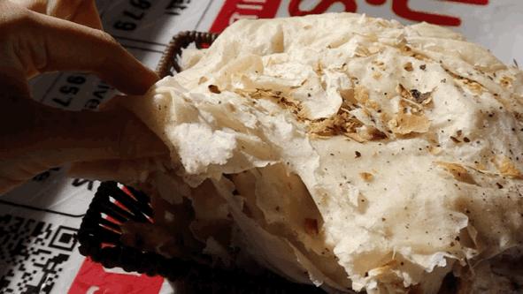 咬下第一口,小麥的香氣先在齒間散開,餅底外層脆得掉渣,內裏卻鬆軟有嚼勁,帶着微微的麥香回甘。