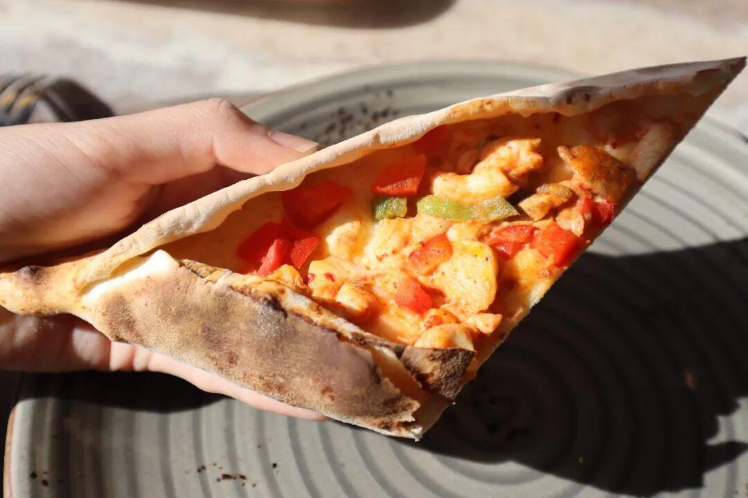 披薩一定更趁熱喫,麪皮是脆脆的,浸潤了紅椒粉與黑胡椒的辛香,烘烤後油脂滲入麪皮,香氣鑽進每一絲纖維。
