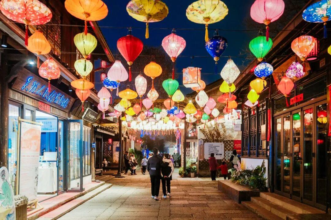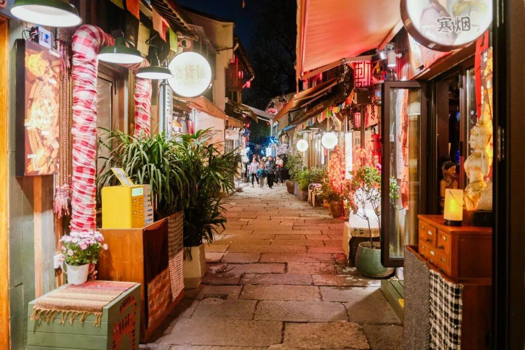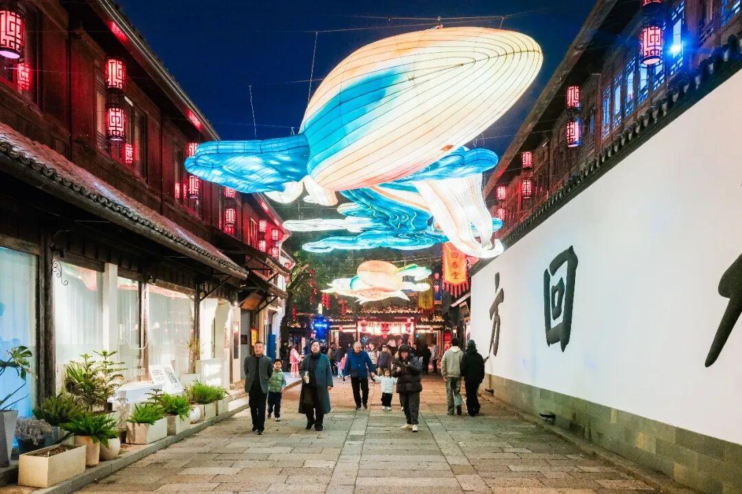 這裏最有特色的就是沿街垂落的魚燈陣,白牆黛瓦配着暖黃的燈串,順着街巷往前走,一步一景都很舒服。